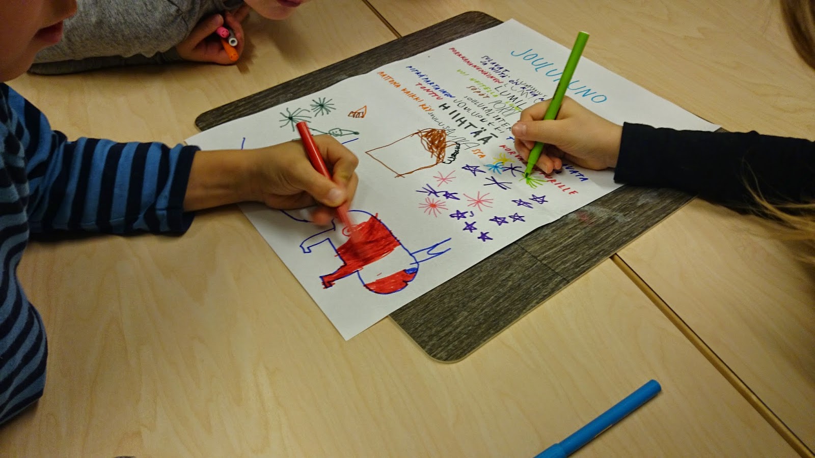 Ohjaajien haasteena oli löytää kaikkia osallistujia kiinnostavaa tekemistä. Eskariryhmä oli innokas piirtäjä, Sammonkodilla taas laulaminen osoittautui mukavaksi yhdessä tekemiseksi. Monissa yhteistapaamisissa lauloimmekin jotakin Sammonkotilaisille tuttua laulua, ja lapset piirsivät lauluun kuvituksen. Myös yhteisten satujen tekeminen sadutus-tekniikalla ja niiden kuvittaminen olivat molemmille ryhmille mielestä tekemistä. Paljon myös juteltiin, esimerkiksi muisteltiin pelejä ja leikkejä ja joulun alla vertailtiin erilaisia jouluperinteitä.