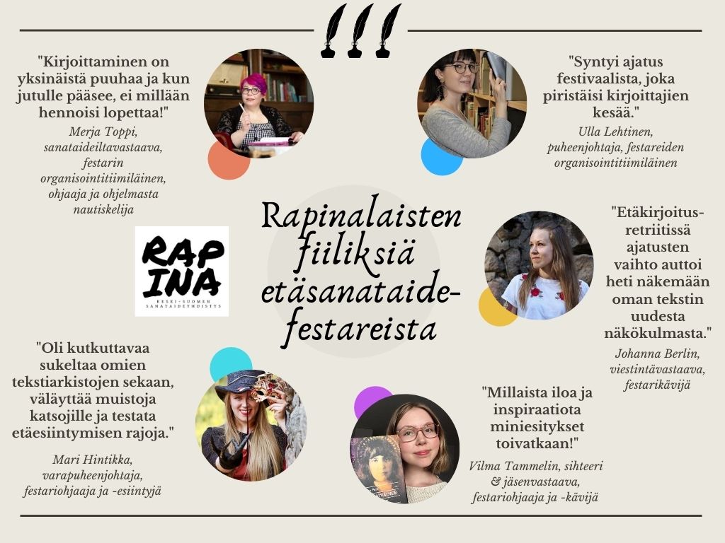 Heinäkuussa pääsimme nauttimaan Rapinan ensimmäisistä etäsanataidefestivaaleista, kun Sanojen juhlaa! -festarit valloittivat somemme ja kotimme ruutujen välityksellä. Viisi rapinalaista kertoo festarikokemuksistaan niin järjestäjän, esiintyjän ja ohjaajan kuin osallistujankin näkökulmista: