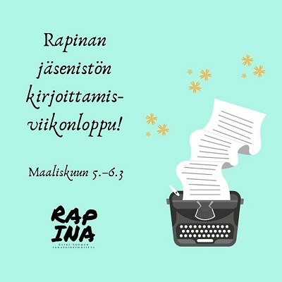 Rapina järjestää jäsenilleen 5.–6.3.2022 Jyväskylän keskustassa, Kortteli Klubin tiloissa, kirjoittamisviikonlopun. Lauantaina sinulla on mahdollisuus osallistua myös ohjattuun kirjoittamishetkeen ja sunnuntaina jopa maratonkirjoittamiseen. (Jos kirjoitusmaraton ei ole sinulle tuttua, lue siitä täältä kohdasta Maksullinen toiminta.)