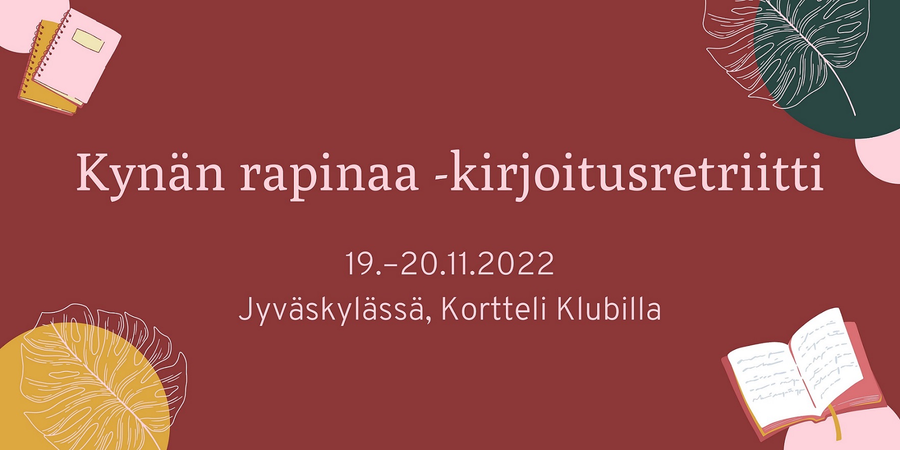 Keski-Suomen sanataideyhdistys Rapina ry järjestää 19.–20.11.2022 kirjoitusretriitin Kortteli Klubilla, Jyväskylän ytimessä. Retriitti tarjoaa rauhallisen ja inspiroivan ympäristön edetä kirjoitustyössä.