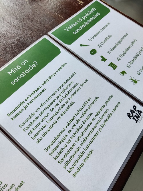Muuramen kirjasto tilasi Rapinalta omaan hankkeeseensa luku- ja kirjoitusintoa lisääviä sanataidepajoja kuntouttavan työtoiminnan ryhmälle.  Osan kerroista veti Rapinan ohjaaja ja osan kirjaston työntekijä Muuramen kirjaston tiloissa. Rapinanlta ohjaajina toimivat Mari Hintikka ja Vilma Tammelin.