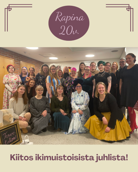 Keski-Suomen sanataideyhdistys Rapina ry täytti lokakuun alussa 20 vuotta. Juhlavuoden kunniaksi järjestimme 11.10.2025 Piippurannan Klubilla juhlagaalan, jossa juhlimme jäsentemme ja muiden kutsuvieraiden kanssa 20-vuotista taivaltamme.